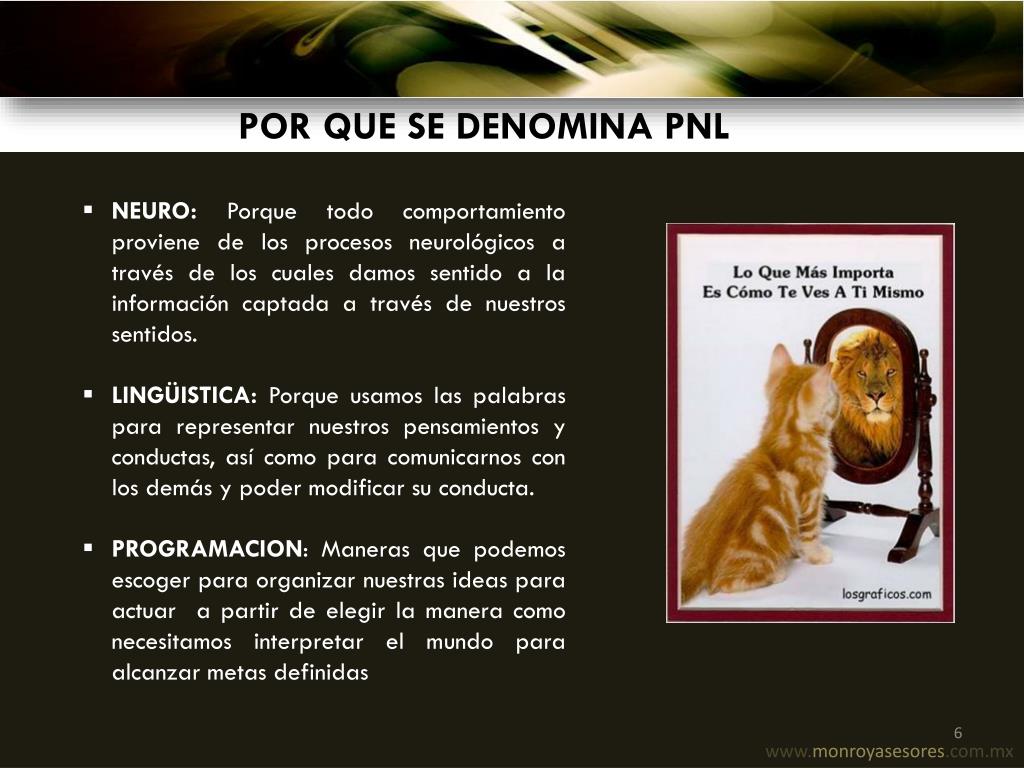 POR QUE SE DENOMINA PNL • NEURO: Porque todo comportamiento proviene de los procesos neurológicos a través de los cuales damos sentido a la información captada a través de nuestros sentidos. • LINGÜISTICA: Porque usamos las palabras para representar nuestros pensamientos y conductas, así como para comunicarnos con los demás y poder modificar su conducta. • PROGRAMACION: Maneras que podemos escoger para organizar nuestras ideas para actuar a partir de elegir la manera como necesitamos interpretar el mundo para alcanzar metas definidas www.monroyasesores.com.mx