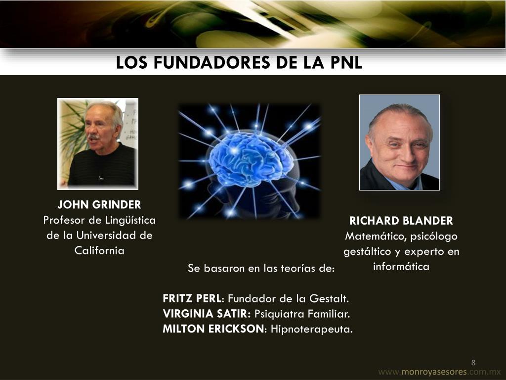 LOS FUNDADORES DE LA PNL JOHN GRINDER Profesor de Lingüística de la Universidad de California RICHARD BLANDER Matemático, psicólogo gestáltico y experto en informática • Se basaron en las teorías de: • FRITZ PERL: Fundador de la Gestalt. • VIRGINIA SATIR: Psiquiatra Familiar. • MILTON ERICKSON: Hipnoterapeuta. www.monroyasesores.com.mx