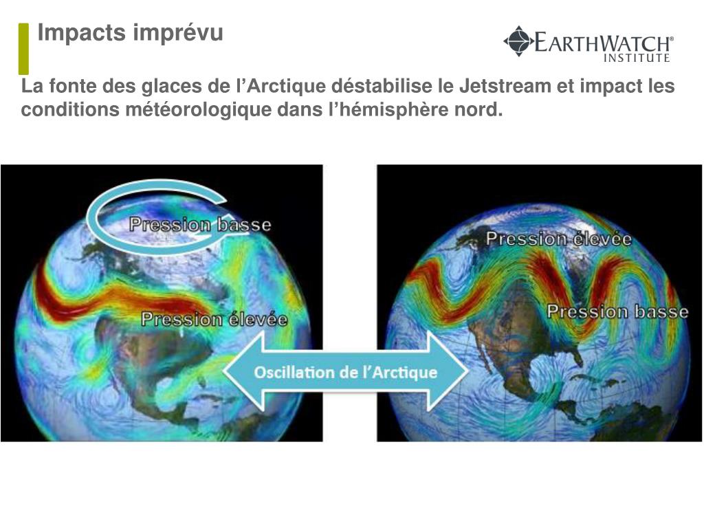 Impacts imprévu • La fonte des glaces de l’Arctiquedéstabilise le Jetstream et impact les conditions météorologiquedansl’hémisphèrenord.
