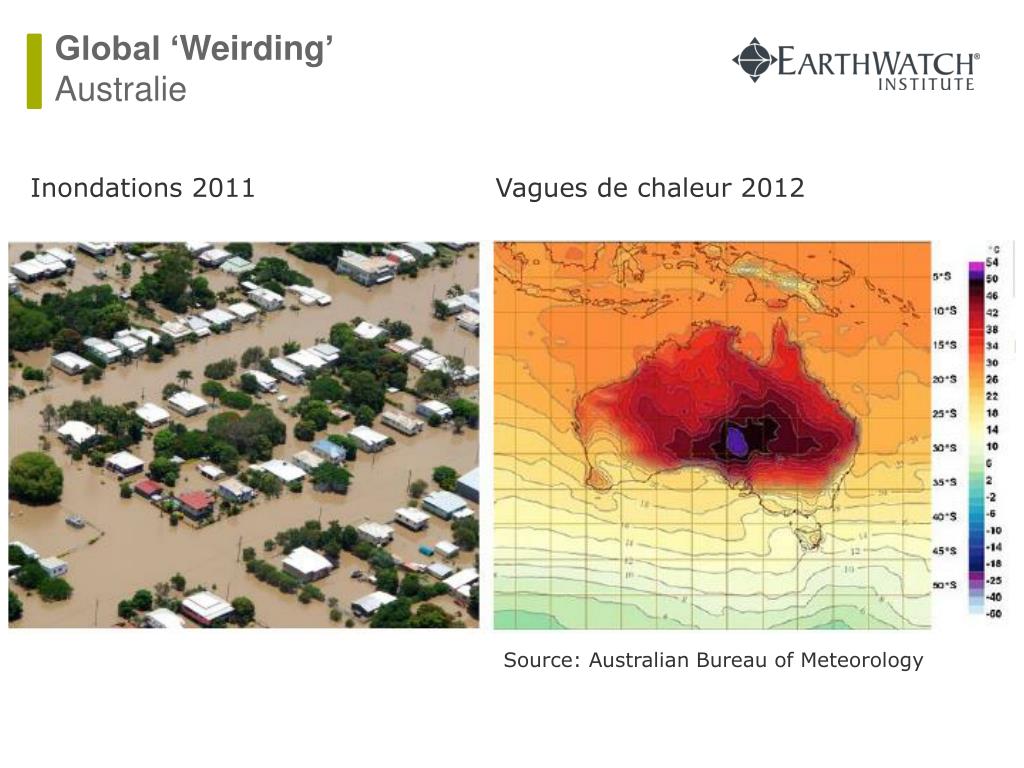 Global ‘Weirding’ Australie Inondations 2011 Vagues de chaleur 2012 Source: Australian Bureau of Meteorology