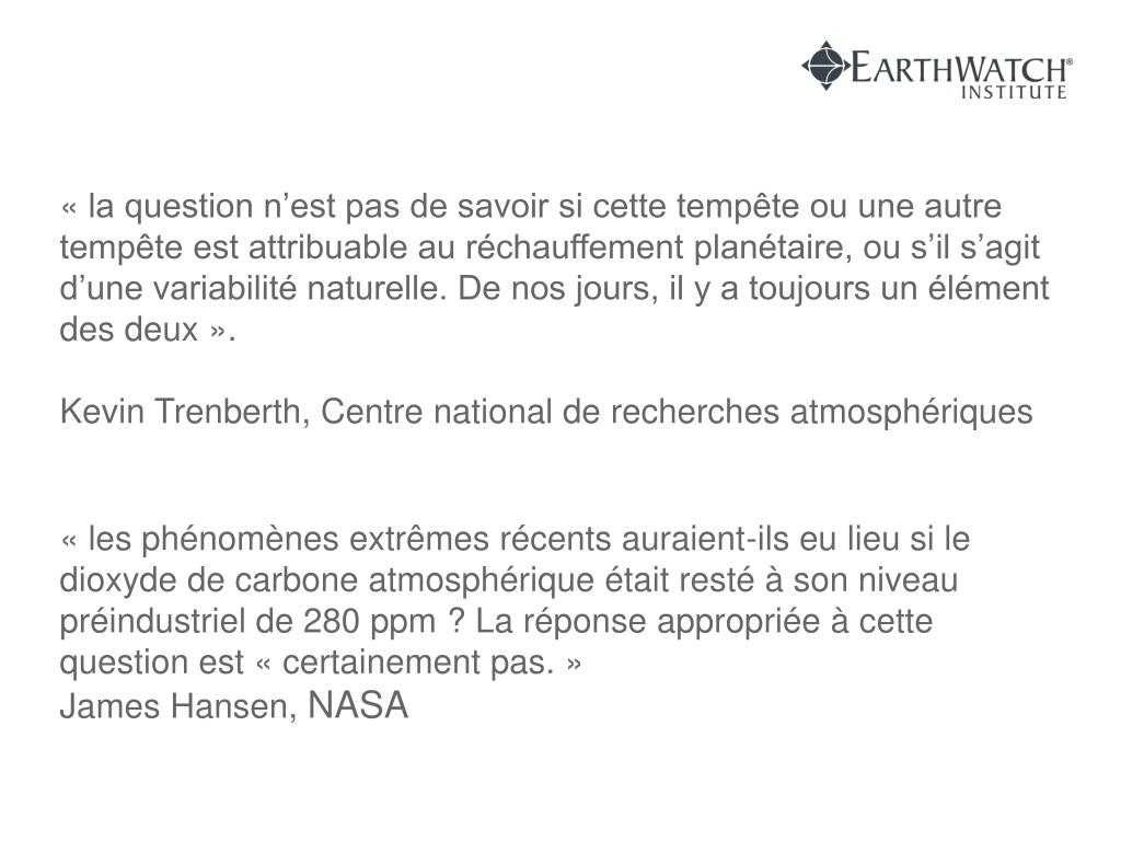 « la question n’est pas de savoir si cette tempête ou une autre tempête est attribuable au réchauffement planétaire, ou s’il s’agit d’une variabilité naturelle. De nos jours, il y a toujours un élément des deux ». Kevin Trenberth, Centre national de recherchesatmosphériques« les phénomènes extrêmes récents auraient-ils eu lieu si le dioxyde de carbone atmosphérique était resté à son niveau préindustriel de 280 ppm ? La réponse appropriée à cette question est « certainement pas. »James Hansen, NASA