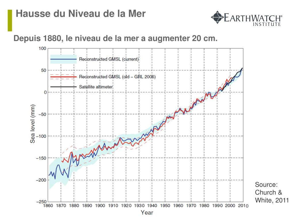 Hausse du Niveau de la Mer Depuis 1880, le niveau de la mer a augmenter 20 cm. Source: Church & White, 2011