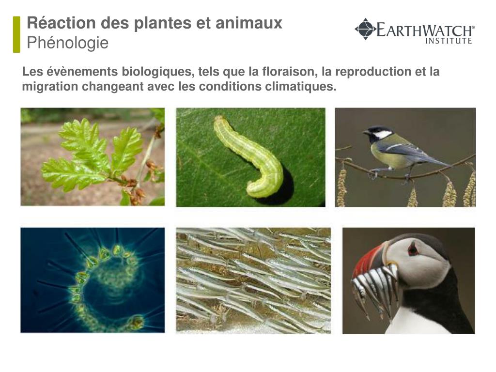 Réaction des plantes et animaux Phénologie Les évènements biologiques, tels que la floraison, la reproduction et la migration changeant avec les conditions climatiques.