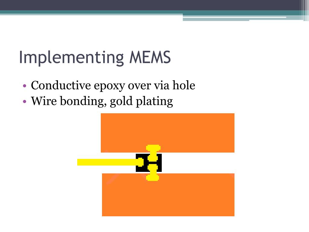Implementing MEMS • Conductive epoxy over via hole • Wire bonding, gold plating
