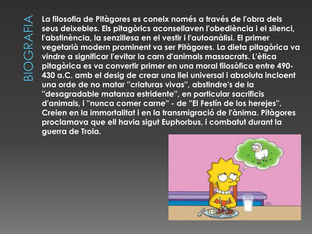 Biografia La filosofia de Pitàgores es coneix només a través de l'obra dels seus deixebles. Els pitagòrics aconsellaven l'obediència i el silenci, l'abstinència, la senzillesa en el vestir i l'autoanàlisi. El primer vegetarià modern prominent va ser Pitàgores. La dieta pitagòrica va vindre a significar l'evitar la carn d'animals massacrats. L'ètica pitagòrica es va convertir primer en una moral filosòfica entre 490-430 a.C. amb el desig de crear una llei universal i absoluta incloent una orde de no matar ''criaturas vivas'', abstindre's de la ''desagradable matanza estridente'', en particular sacrificis d'animals, i ''nunca comer carne'' - de ''El Festín de los herejes''. Creien en la immortalitat i en la transmigració de l'ànima. Pitàgores proclamava que ell havia sigut Euphorbus, i combatut durant la guerra de Troia.