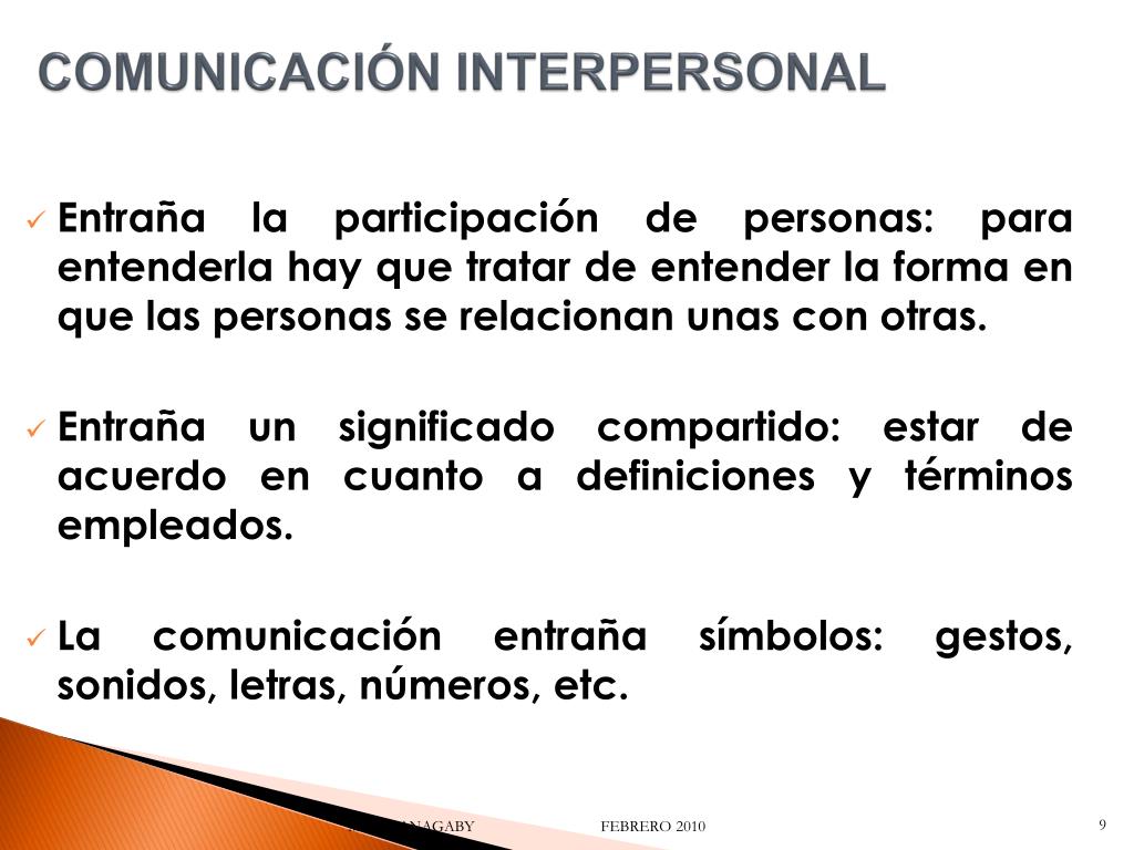 COMUNICACIÓN INTERPERSONAL • Entraña la participación de personas: para entenderla hay que tratar de entender la forma en que las personas se relacionan unas con otras. • Entraña un significado compartido: estar de acuerdo en cuanto a definiciones y términos empleados. • La comunicación entraña símbolos: gestos, sonidos, letras, números, etc. MTRA. ANAGABY FEBRERO 2010