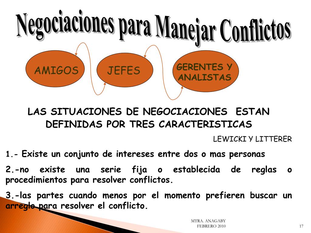 Negociaciones para Manejar Conflictos GERENTES Y ANALISTAS AMIGOS JEFES LAS SITUACIONES DE NEGOCIACIONES ESTAN DEFINIDAS POR TRES CARACTERISTICAS LEWICKI Y LITTERER 1.- Existe un conjunto de intereses entre dos o mas personas 2.-no existe una serie fija o establecida de reglas o procedimientos para resolver conflictos. 3.-las partes cuando menos por el momento prefieren buscar un arreglo para resolver el conflicto. MTRA. ANAGABY FEBRERO 2010