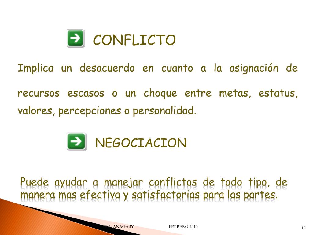 CONFLICTO Implica un desacuerdo en cuanto a la asignación derecursos escasos o un choque entre metas, estatus, valores, percepciones o personalidad. NEGOCIACION Puede ayudar a manejar conflictos de todo tipo, de manera mas efectiva y satisfactorias para las partes. MTRA. ANAGABY FEBRERO 2010