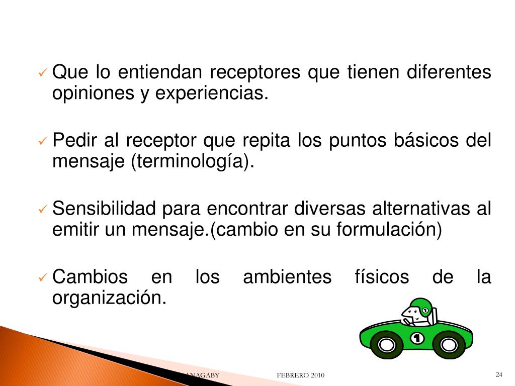 Que lo entiendan receptores que tienen diferentes opiniones y experiencias. • Pedir al receptor que repita los puntos básicos del mensaje (terminología). • Sensibilidad para encontrar diversas alternativas al emitir un mensaje.(cambio en su formulación) • Cambios en los ambientes físicos de la organización. MTRA. ANAGABY FEBRERO 2010