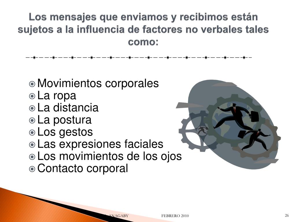 Los mensajes que enviamos y recibimos están sujetos a la influencia de factores no verbales tales como: • Movimientos corporales • La ropa • La distancia • La postura • Los gestos • Las expresiones faciales • Los movimientos de los ojos • Contacto corporal MTRA. ANAGABY FEBRERO 2010