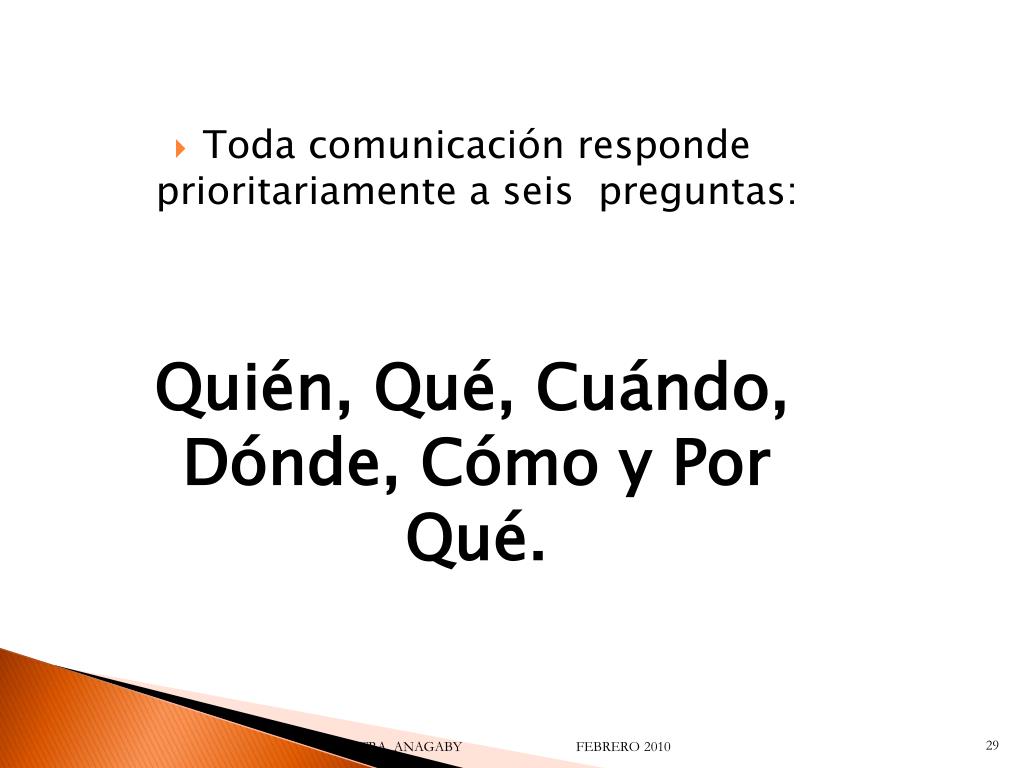 Toda comunicación responde prioritariamente a seis preguntas: Quién, Qué, Cuándo, Dónde, Cómo y Por Qué. MTRA. ANAGABY FEBRERO 2010