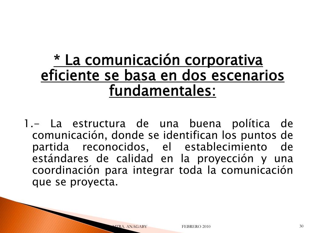 * La comunicación corporativa eficiente se basa en dos escenarios fundamentales: 1.- La estructura de una buena política de comunicación, donde se identifican los puntos de partida reconocidos, el establecimiento de estándares de calidad en la proyección y una coordinación para integrar toda la comunicación que se proyecta. MTRA. ANAGABY FEBRERO 2010