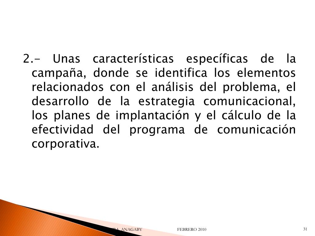 2.- Unas características específicas de la campaña, donde se identifica los elementos relacionados con el análisis del problema, el desarrollo de la estrategia comunicacional, los planes de implantación y el cálculo de la efectividad del programa de comunicación corporativa. MTRA. ANAGABY FEBRERO 2010