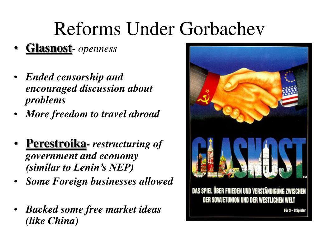 Reforms Under Gorbachev • Glasnost- openness • Ended censorship and encouraged discussion about problems • More freedom to travel abroad • Perestroika- restructuring of government and economy (similar to Lenin’s NEP) • Some Foreign businesses allowed • Backed some free market ideas (like China)
