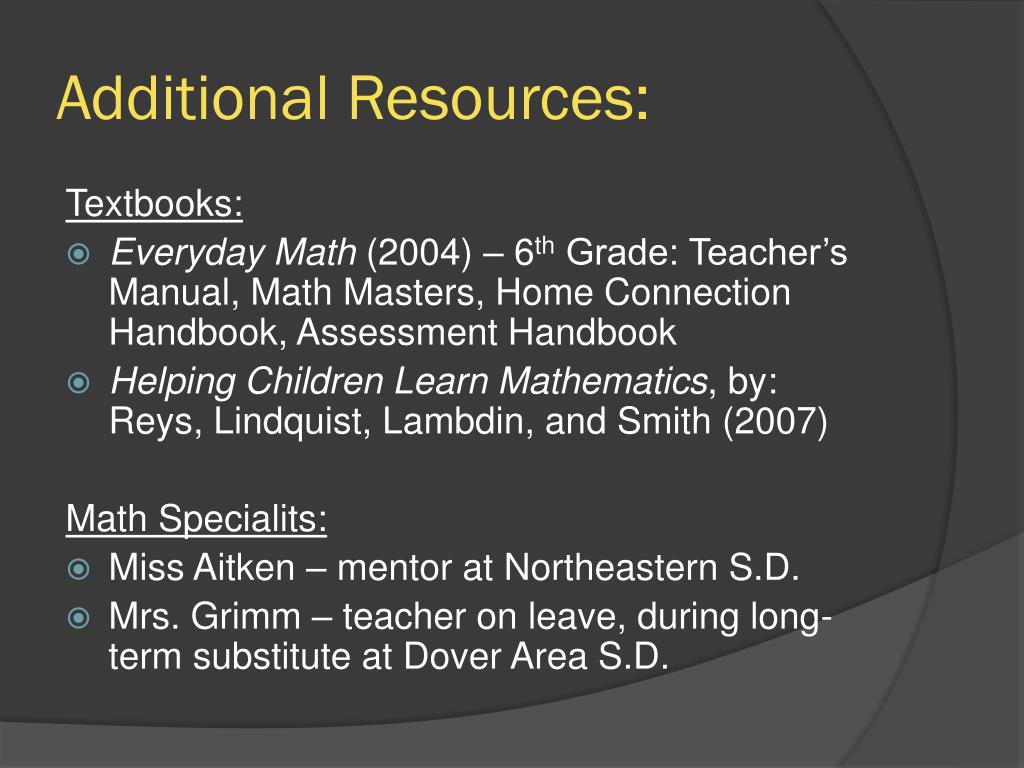 Additional Resources: Textbooks: • Everyday Math (2004) – 6th Grade: Teacher’s Manual, Math Masters, Home Connection Handbook, Assessment Handbook • Helping Children Learn Mathematics, by: Reys, Lindquist, Lambdin, and Smith (2007) Math Specialits: • Miss Aitken– mentor at Northeastern S.D. • Mrs. Grimm– teacher on leave, during long-term substitute at Dover Area S.D.