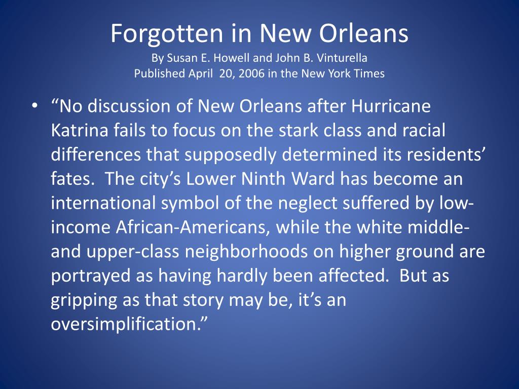 Forgotten in New OrleansBy Susan E. Howell and John B. VinturellaPublished April 20, 2006 in the New York Times • “No discussion of New Orleans after Hurricane Katrina fails to focus on the stark class and racial differences that supposedly determined its residents’ fates. The city’s Lower Ninth Ward has become an international symbol of the neglect suffered by low-income African-Americans, while the white middle- and upper-class neighborhoods on higher ground are portrayed as having hardly been affected. But as gripping as that story may be, it’s an oversimplification.”