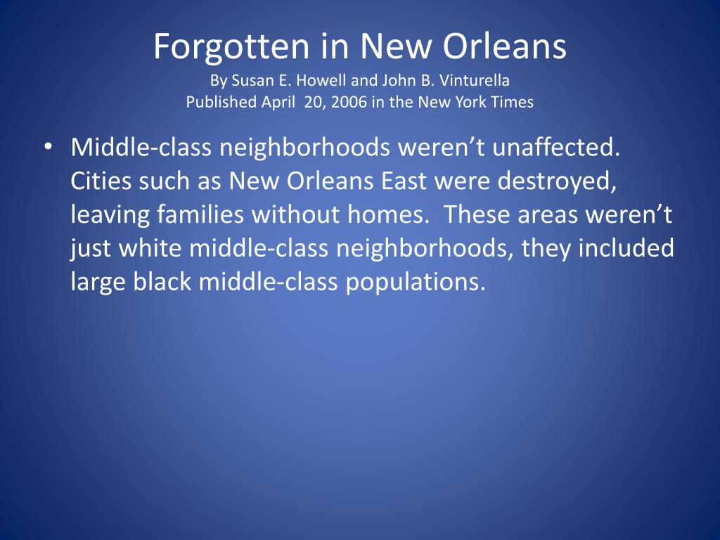 Forgotten in New OrleansBy Susan E. Howell and John B. VinturellaPublished April 20, 2006 in the New York Times • Middle-class neighborhoods weren’t unaffected. Cities such as New Orleans East were destroyed, leaving families without homes. These areas weren’t just white middle-class neighborhoods, they included large black middle-class populations.