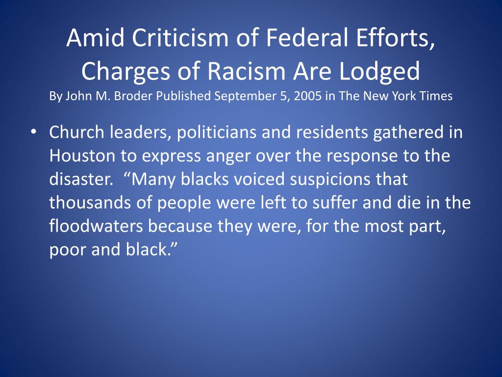 Amid Criticism of Federal Efforts, Charges of Racism Are LodgedBy John M. Broder Published September 5, 2005 in The New York Times • Church leaders, politicians and residents gathered in Houston to express anger over the response to the disaster. “Many blacks voiced suspicions that thousands of people were left to suffer and die in the floodwaters because they were, for the most part, poor and black.”