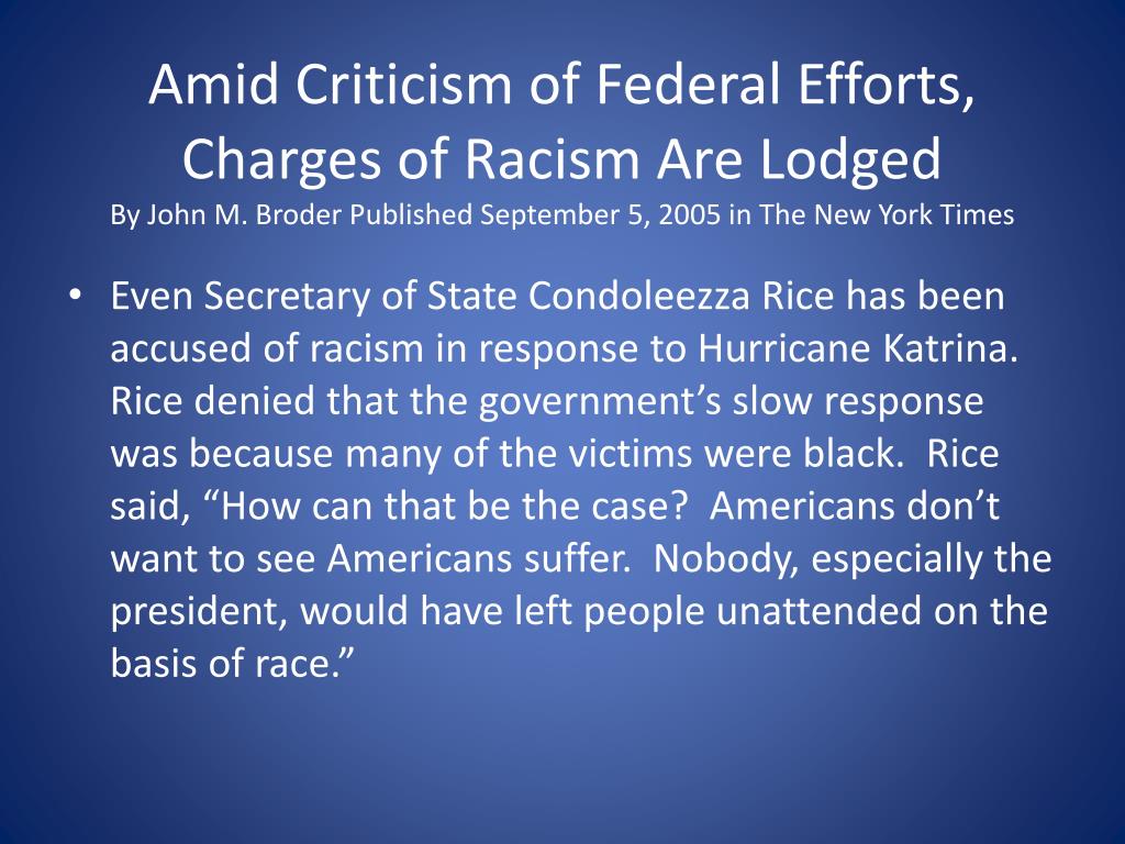 Amid Criticism of Federal Efforts, Charges of Racism Are LodgedBy John M. Broder Published September 5, 2005 in The New York Times • Even Secretary of State Condoleezza Rice has been accused of racism in response to Hurricane Katrina. Rice denied that the government’s slow response was because many of the victims were black. Rice said, “How can that be the case? Americans don’t want to see Americans suffer. Nobody, especially the president, would have left people unattended on the basis of race.”
