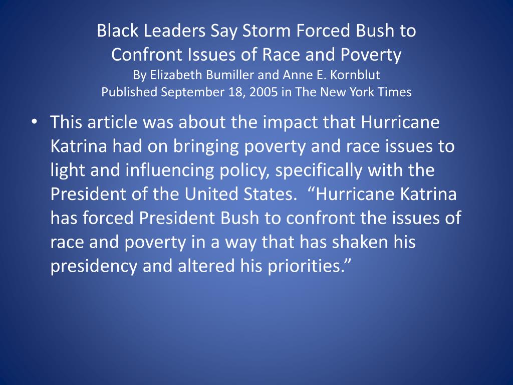 Black Leaders Say Storm Forced Bush to Confront Issues of Race and PovertyBy Elizabeth Bumiller and Anne E. KornblutPublished September 18, 2005 in The New York Times • This article was about the impact that Hurricane Katrina had on bringing poverty and race issues to light and influencing policy, specifically with the President of the United States. “Hurricane Katrina has forced President Bush to confront the issues of race and poverty in a way that has shaken his presidency and altered his priorities.”