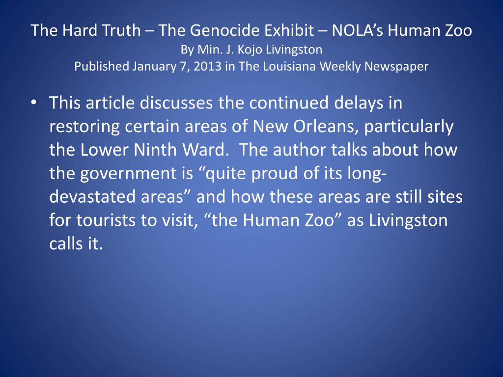 The Hard Truth – The Genocide Exhibit – NOLA’s Human ZooBy Min. J. Kojo LivingstonPublished January 7, 2013 in The Louisiana Weekly Newspaper • This article discusses the continued delays in restoring certain areas of New Orleans, particularly the Lower Ninth Ward. The author talks about how the government is “quite proud of its long-devastated areas” and how these areas are still sites for tourists to visit, “the Human Zoo” as Livingston calls it.