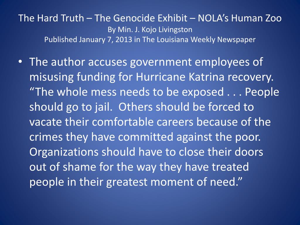 The Hard Truth – The Genocide Exhibit – NOLA’s Human ZooBy Min. J. Kojo LivingstonPublished January 7, 2013 in The Louisiana Weekly Newspaper • The author accuses government employees of misusing funding for Hurricane Katrina recovery. “The whole mess needs to be exposed . . . People should go to jail. Others should be forced to vacate their comfortable careers because of the crimes they have committed against the poor. Organizations should have to close their doors out of shame for the way they have treated people in their greatest moment of need.”