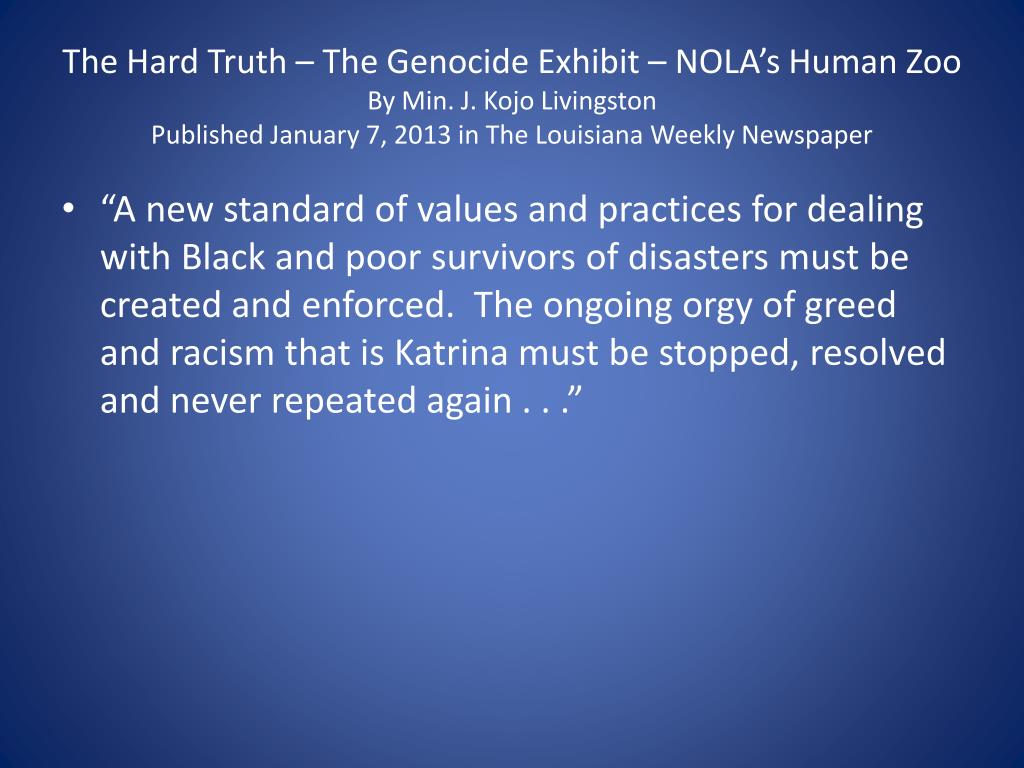 The Hard Truth – The Genocide Exhibit – NOLA’s Human ZooBy Min. J. Kojo LivingstonPublished January 7, 2013 in The Louisiana Weekly Newspaper • “A new standard of values and practices for dealing with Black and poor survivors of disasters must be created and enforced. The ongoing orgy of greed and racism that is Katrina must be stopped, resolved and never repeated again . . .”