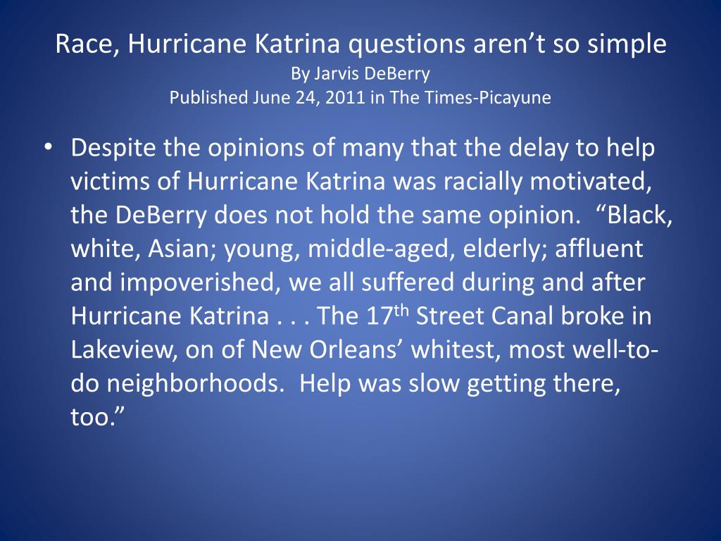 Race, Hurricane Katrina questions aren’t so simpleBy Jarvis DeBerryPublished June 24, 2011 in The Times-Picayune • Despite the opinions of many that the delay to help victims of Hurricane Katrina was racially motivated, the DeBerry does not hold the same opinion. “Black, white, Asian; young, middle-aged, elderly; affluent and impoverished, we all suffered during and after Hurricane Katrina . . . The 17th Street Canal broke in Lakeview, on of New Orleans’ whitest, most well-to-do neighborhoods. Help was slow getting there, too.”