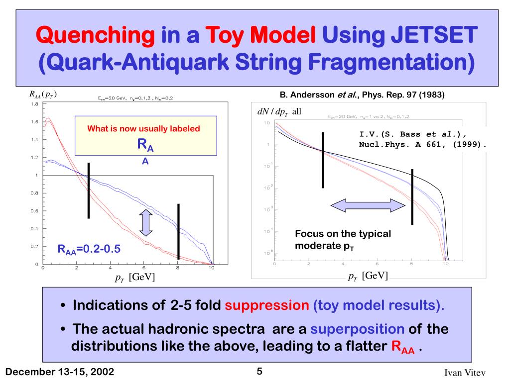 Quenching in a Toy Model Using JETSET(Quark-Antiquark String Fragmentation) B. Andersson et al., Phys. Rep. 97 (1983) What is now usually labeled I.V.(S. Bass et al.), Nucl.Phys. A 661, (1999). RAA Focus on the typical moderate pT RAA=0.2-0.5 • Indications of 2-5 fold suppression(toy model results). • The actual hadronic spectra are a superposition of the • distributions like the above, leading to a flatter RAA . Ivan Vitev