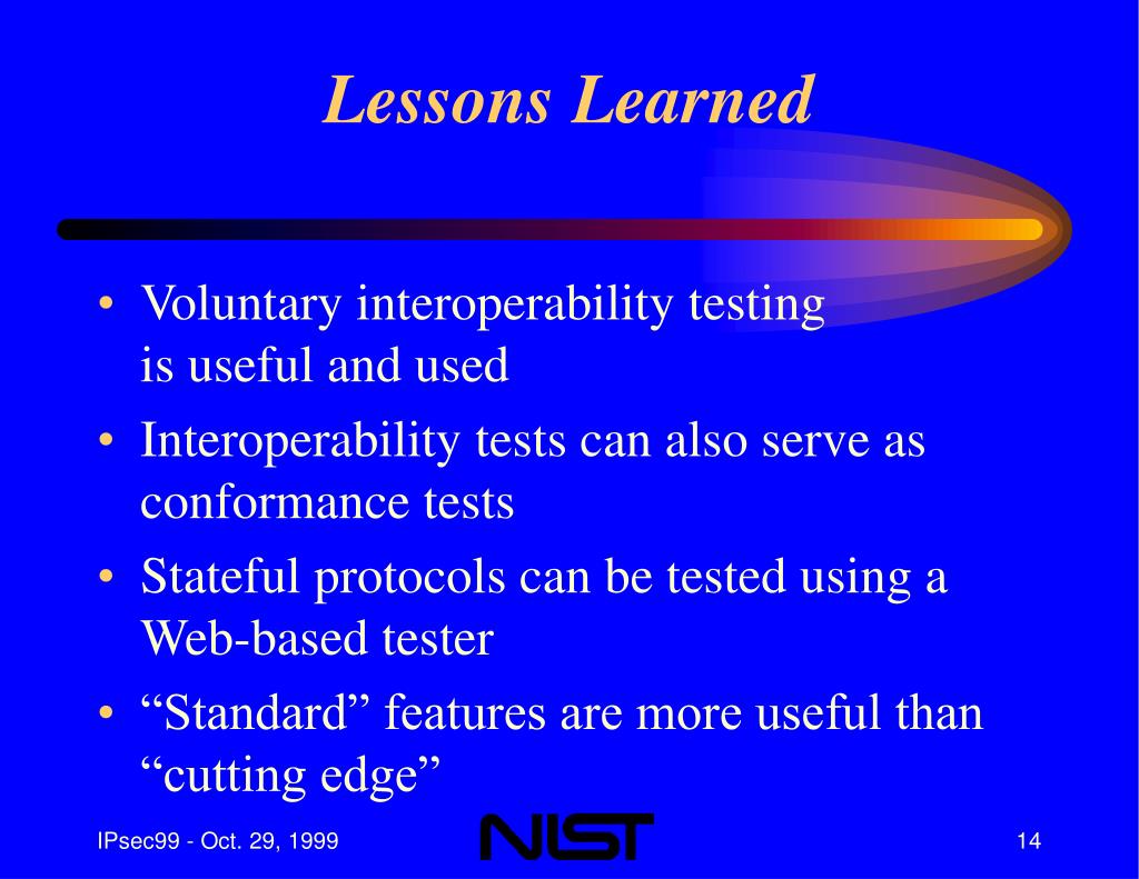 Lessons Learned • Voluntary interoperability testing is useful and used • Interoperability tests can also serve as conformance tests • Stateful protocols can be tested using a Web-based tester • “Standard” features are more useful than “cutting edge”