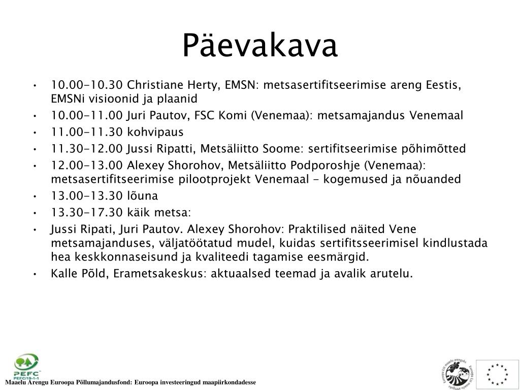 Päevakava • 10.00-10.30 Christiane Herty, EMSN: metsasertifitseerimise areng Eestis, EMSNi visioonid ja plaanid • 10.00-11.00 Juri Pautov, FSC Komi (Venemaa): metsamajandus Venemaal • 11.00-11.30 kohvipaus • 11.30-12.00 Jussi Ripatti, Metsäliitto Soome: sertifitseerimise põhimõtted • 12.00-13.00 Alexey Shorohov, Metsäliitto Podporoshje (Venemaa): metsasertifitseerimise pilootprojekt Venemaal - kogemused ja nõuanded • 13.00-13.30 lõuna • 13.30-17.30 käik metsa: • Jussi Ripati, Juri Pautov. Alexey Shorohov: Praktilised näited Vene metsamajanduses, väljatöötatud mudel, kuidas sertifitsseerimisel kindlustada hea keskkonnaseisund ja kvaliteedi tagamise eesmärgid. • Kalle Põld, Erametsakeskus: aktuaalsed teemad ja avalik arutelu.