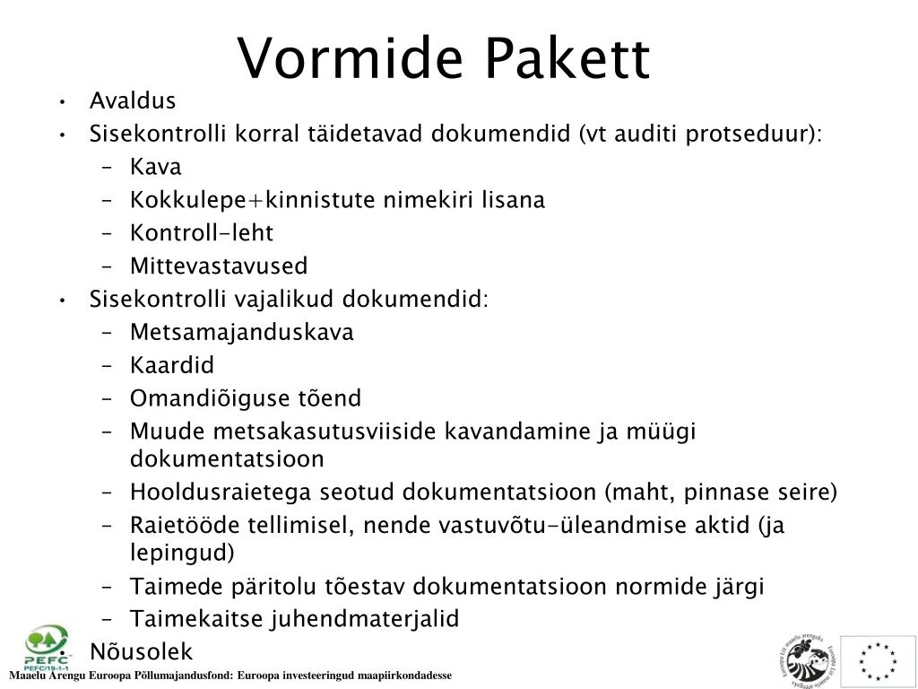 Vormide Pakett • Avaldus • Sisekontrolli korral täidetavad dokumendid (vt auditi protseduur): • Kava • Kokkulepe+kinnistute nimekiri lisana • Kontroll-leht • Mittevastavused • Sisekontrolli vajalikud dokumendid: • Metsamajanduskava • Kaardid • Omandiõiguse tõend • Muude metsakasutusviiside kavandamine ja müügi dokumentatsioon • Hooldusraietega seotud dokumentatsioon (maht, pinnase seire) • Raietööde tellimisel, nende vastuvõtu-üleandmise aktid (ja lepingud) • Taimede päritolu tõestav dokumentatsioon normide järgi • Taimekaitse juhendmaterjalid • Nõusolek