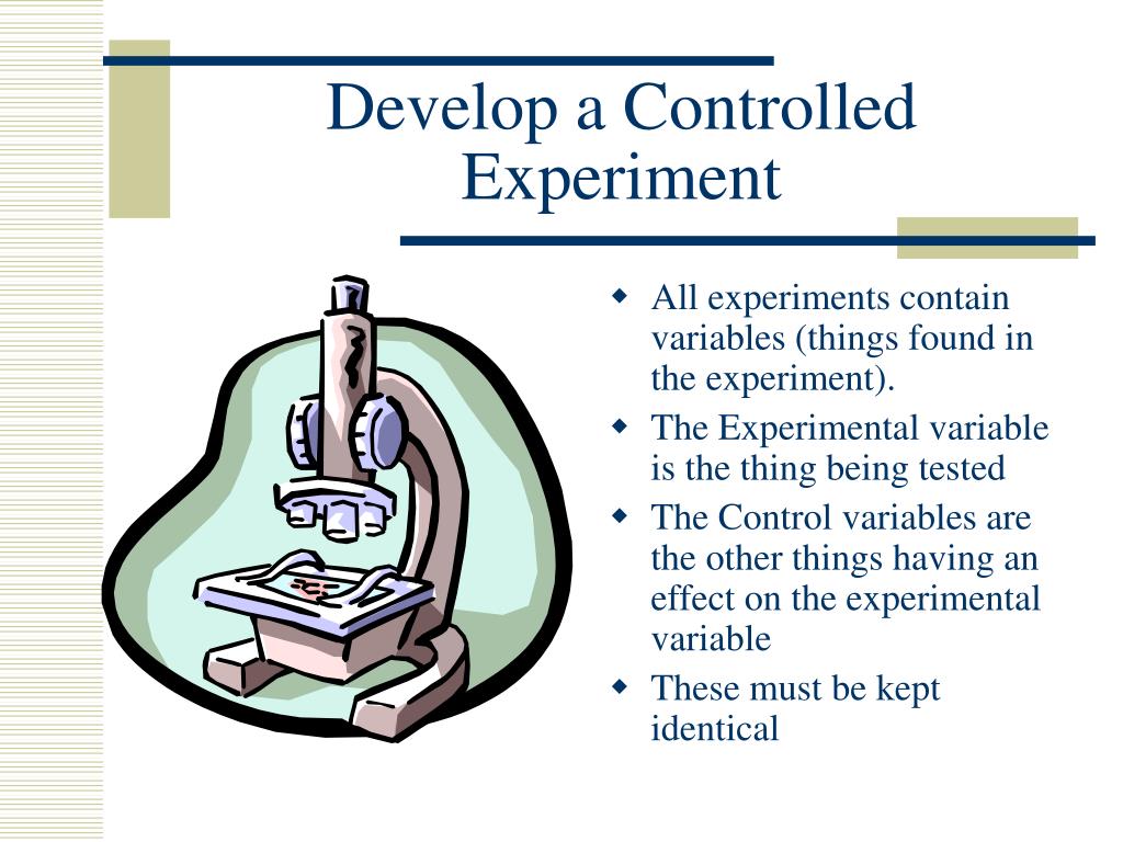 Develop a Controlled Experiment • All experiments contain variables (things found in the experiment). • The Experimental variable is the thing being tested • The Control variables are the other things having an effect on the experimental variable • These must be kept identical