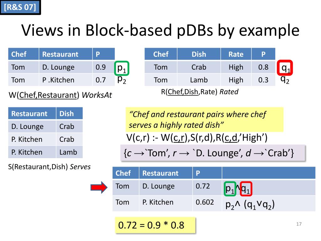 [R&S 07] Views in Block-based pDBs by example p1 q1 p2 q2 R(Chef,Dish,Rate) Rated W(Chef,Restaurant) WorksAt “Chef and restaurant pairs where chef serves a highly rated dish” V(c,r) :- W(c,r),S(r,d),R(c,d,’High’) {c→`Tom’, r→ `D. Lounge’, d→`Crab’} S(Restaurant,Dish) Serves 0.72 = 0.9 * 0.8