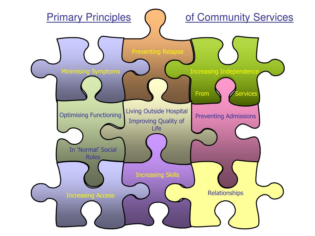 Preventing Relapse Minimising Symptoms Increasing Independence From Services Living Outside Hospital Optimising Functioning Preventing Admissions Improving Quality of Life In ‘Normal’ Social Roles Increasing Skills Relationships Increasing Access Primary Principles of Community Services