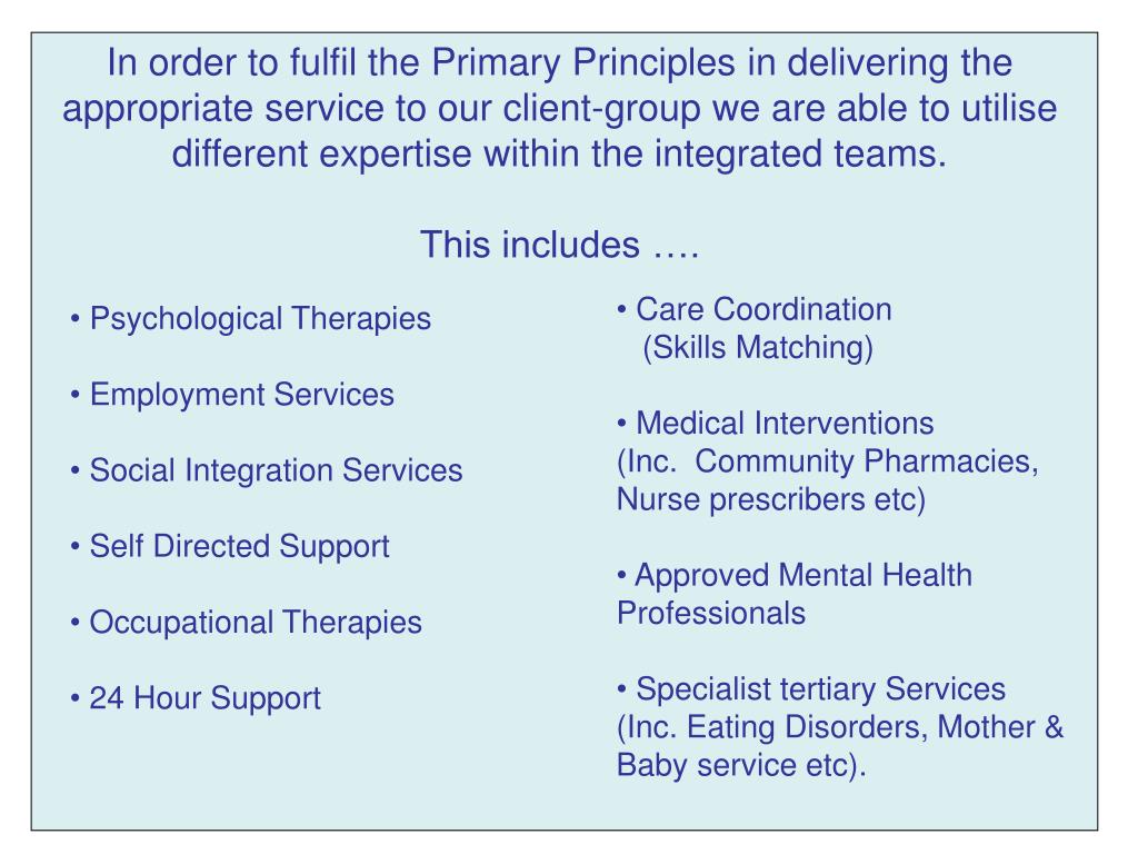 The teams are integrated and ‘functional’ and deliver the appropriate care by use of specialist therapies from staff utilising evidence based approaches such as Psychosocial Interventions, Cognitive Therapy and Family Interventions. But … The primary principles that are adhered to in all community mental health services are highlighted in the next slide …