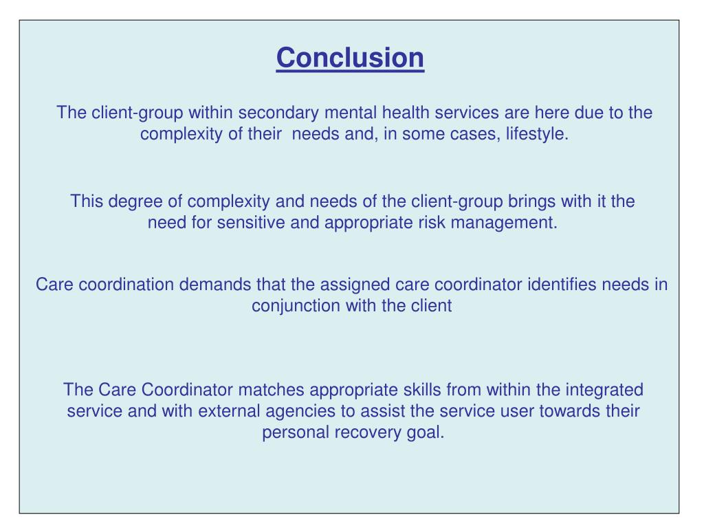 Conclusion The client-group within secondary mental health services are here due to the complexity of their needs and, in some cases, lifestyle. This degree of complexity and needs of the client-group brings with it the need for sensitive and appropriate risk management. Care coordination demands that the assigned care coordinator identifies needs in conjunction with the client The Care Coordinator matches appropriate skills from within the integrated service and with external agencies to assist the service user towards their personal recovery goal.