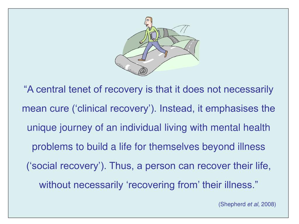 “A central tenet of recovery is that it does not necessarily mean cure (‘clinical recovery’). Instead, it emphasises the unique journey of an individual living with mental health problems to build a life for themselves beyond illness (‘social recovery’). Thus, a person can recover their life, without necessarily ‘recovering from’ their illness.” (Shepherd et al, 2008)