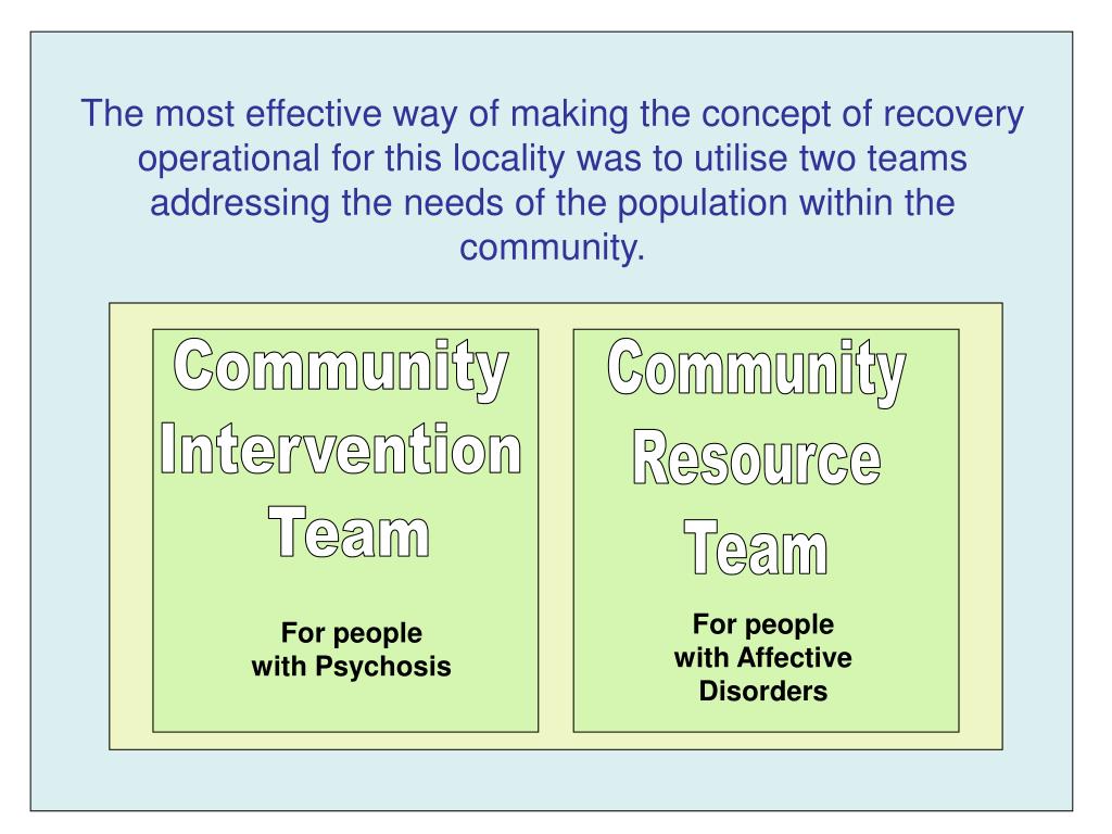 The most effective way of making the concept of recovery operational for this locality was to utilise two teams addressing the needs of the population within the community. Community Intervention Team Community Resource Team For people with Affective Disorders For people with Psychosis