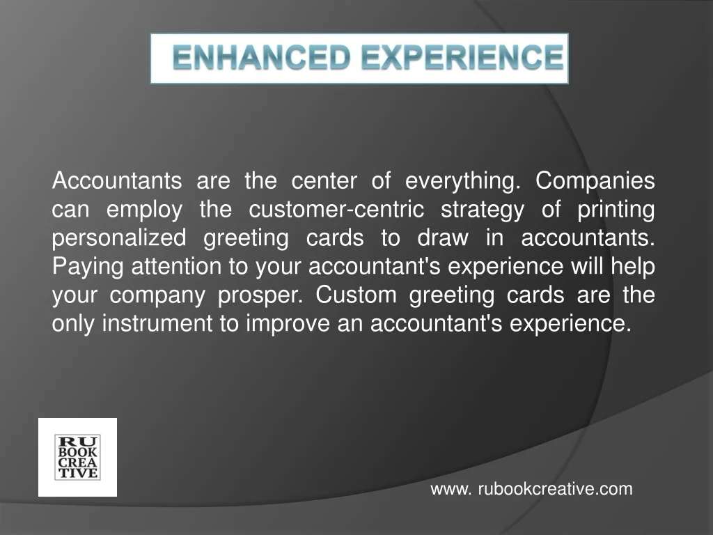 Accountants are the center of everything. Companies can employ the customer-centric strategy of printing personalized greeting cards to draw in accountants. Paying attention to your accountant's experience will help your company prosper. Custom greeting cards are the only instrument to improve an accountant's experience. Enhanced experience www. rubookcreative.com