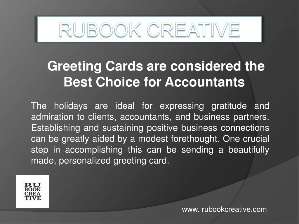 Developing an excellent connection with your accountants will benefit your company greatly. This technique will always yield more benefits than costs. To make them stand out, send these greeting cards on noteworthy occasions or during significant anniversaries. Fosters brighter connections www. rubookcreative.com