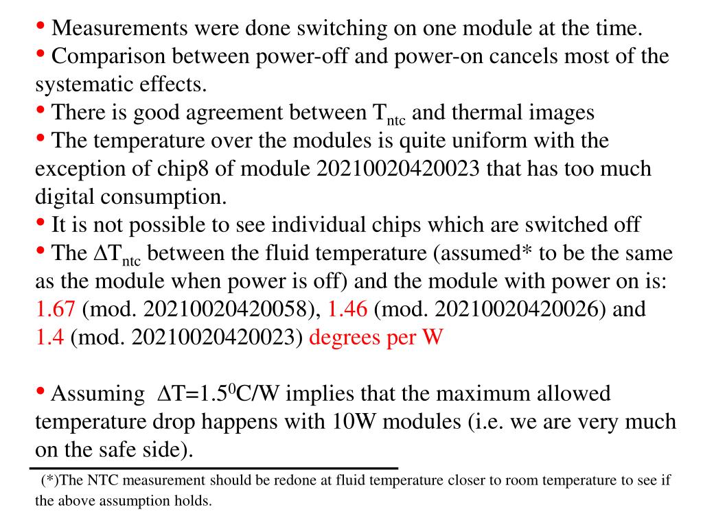 Measurements were done switching on one module at the time. • Comparison between power-off and power-on cancels most of the systematic effects. • There is good agreement between Tntc and thermal images • The temperature over the modules is quite uniform with the exception of chip8 of module 20210020420023 that has too much digital consumption. • It is not possible to see individual chips which are switched off • The DTntc between the fluid temperature (assumed* to be the same as the module when power is off) and the module with power on is: 1.67 (mod. 20210020420058), 1.46 (mod. 20210020420026) and 1.4 (mod. 20210020420023) degrees per W • Assuming DT=1.50C/W implies that the maximum allowed temperature drop happens with 10W modules (i.e. we are very much on the safe side). • (*)The NTC measurement should be redone at fluid temperature closer to room temperature to see if the above assumption holds.