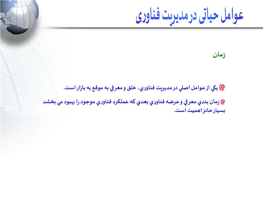 عوامل حياتی در مديريت فناوری • زمان • يکي از عوامل اصلي در مديريت فناوري، خلق و معرفي به موقع به بازار است. • زمان بندي معرفي و عرضه فناوري بعدي که عملکرد فناوري موجود را بهبود مي بخشد بسيار حائز اهميت است.