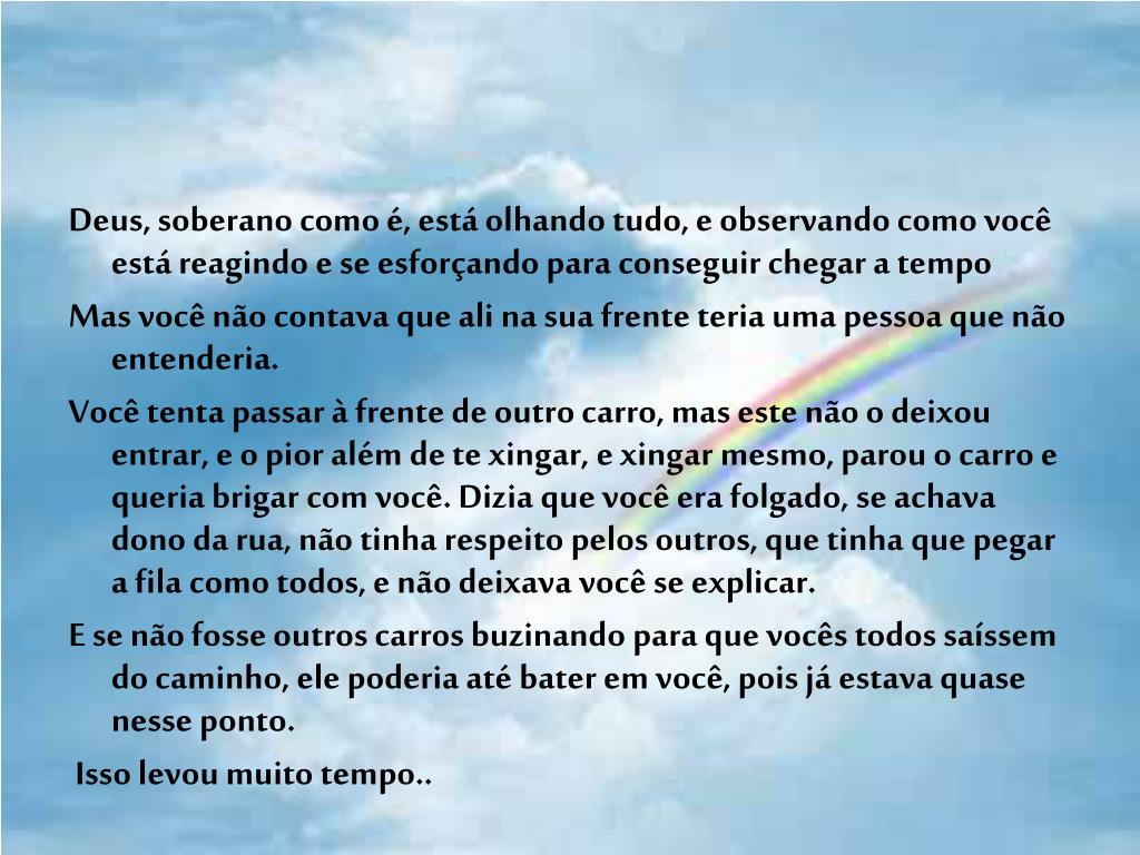 Deus, soberano como é, está olhando tudo, e observando como você está reagindo e se esforçando para conseguir chegar a tempo Mas você não contava que ali na sua frente teria uma pessoa que não entenderia. Você tenta passar à frente de outro carro, mas este não o deixou entrar, e o pior além de te xingar, e xingar mesmo, parou o carro e queria brigar com você. Dizia que você era folgado, se achava dono da rua, não tinha respeito pelos outros, que tinha que pegar a fila como todos, e não deixava você se explicar. E se não fosse outros carros buzinando para que vocês todos saíssem do caminho, ele poderia até bater em você, pois já estava quase nesse ponto. Isso levou muito tempo..