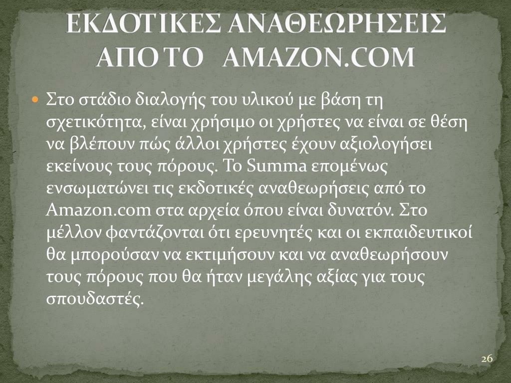 ΕΚΔΟΤΙΚΕΣ ΑΝΑΘΕΩΡΗΣΕΙΣ ΑΠΟ ΤΟ AMAZON.COM • Στο στάδιο διαλογής του υλικού με βάση τη σχετικότητα, είναι χρήσιμο οι χρήστες να είναι σε θέση να βλέπουν πώς άλλοι χρήστες έχουν αξιολογήσει εκείνους τους πόρους. Το Summa επομένως ενσωματώνει τις εκδοτικές αναθεωρήσεις από το Amazon.com στα αρχεία όπου είναι δυνατόν. Στο μέλλον φαντάζονται ότι ερευνητές και οι εκπαιδευτικοί θα μπορούσαν να εκτιμήσουν και να αναθεωρήσουν τους πόρους που θα ήταν μεγάλης αξίας για τους σπουδαστές.