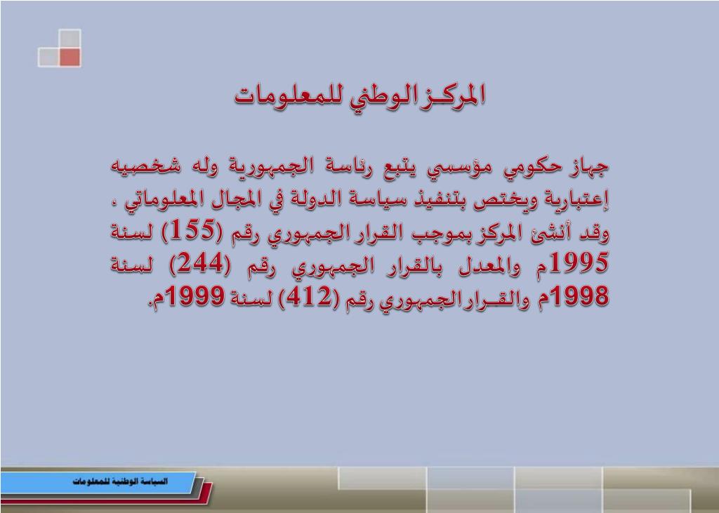 الجمهورية اليمنية رئاسة الجمهورية المركز الوطني للمعلومات. المرك ـــــ ز الوطني للمعلومات