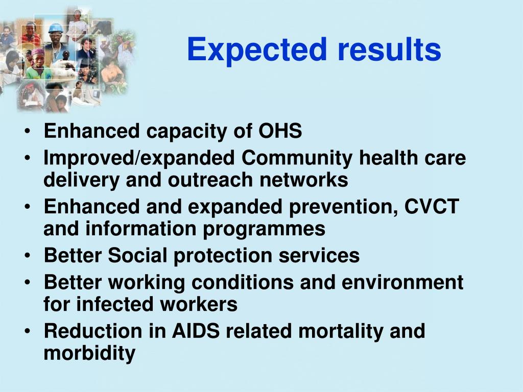 Expected results • Enhanced capacity of OHS • Improved/expanded Community health care delivery and outreach networks • Enhanced and expanded prevention, CVCT and information programmes • Better Social protection services • Better working conditions and environment for infected workers • Reduction in AIDS related mortality and morbidity