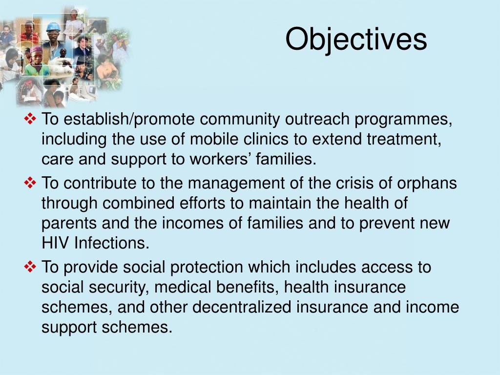 Objectives • To establish/promote community outreach programmes, including the use of mobile clinics to extend treatment, care and support to workers’ families. • To contribute to the management of the crisis of orphans through combined efforts to maintain the health of parents and the incomes of families and to prevent new HIV Infections. • To provide social protection which includes access to social security, medical benefits, health insurance schemes, and other decentralized insurance and income support schemes.