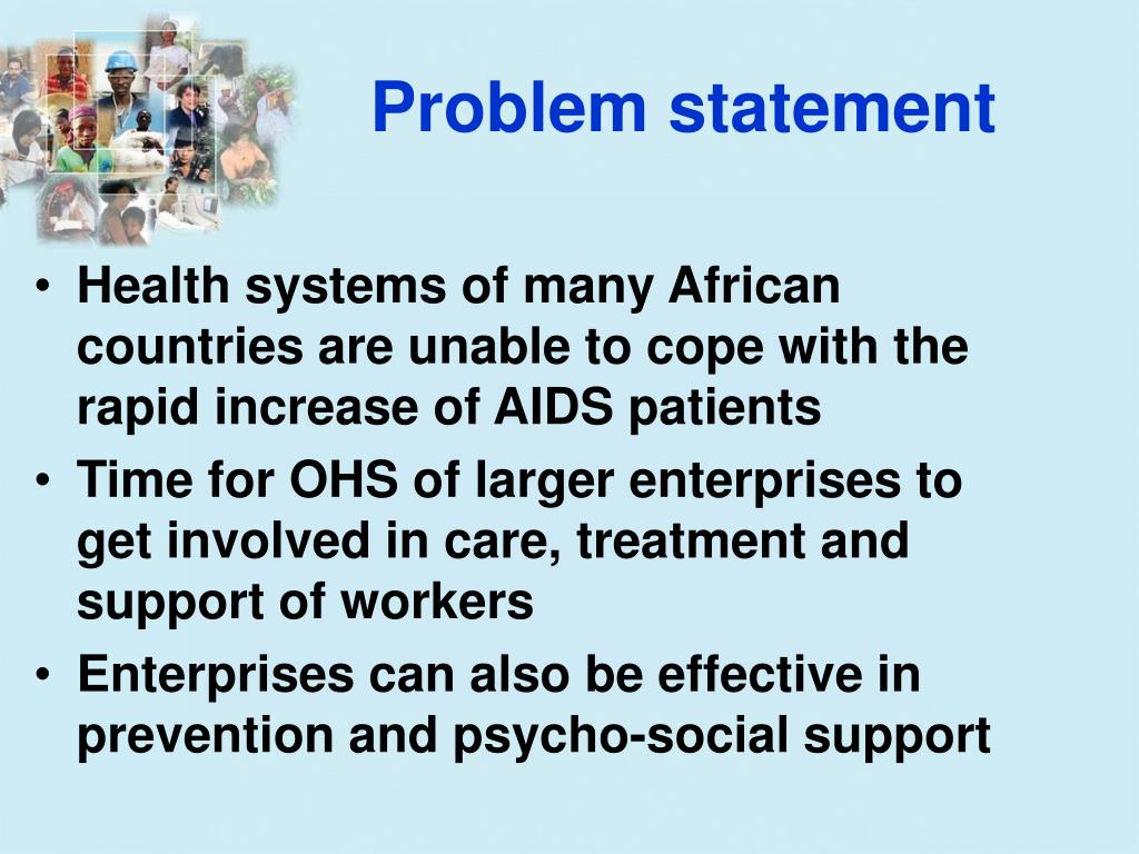 Problem statement • Health systems of many African countries are unable to cope with the rapid increase of AIDS patients • Time for OHS of larger enterprises to get involved in care, treatment and support of workers • Enterprises can also be effective in prevention and psycho-social support