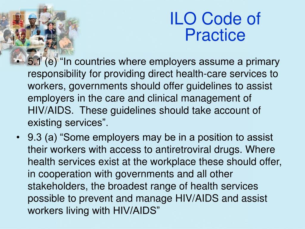 ILO Code of Practice • 5.1 (e) “In countries where employers assume a primary responsibility for providing direct health-care services to workers, governments should offer guidelines to assist employers in the care and clinical management of HIV/AIDS. These guidelines should take account of existing services”. • 9.3 (a) “Some employers may be in a position to assist their workers with access to antiretroviral drugs. Where health services exist at the workplace these should offer, in cooperation with governments and all other stakeholders, the broadest range of health services possible to prevent and manage HIV/AIDS and assist workers living with HIV/AIDS”